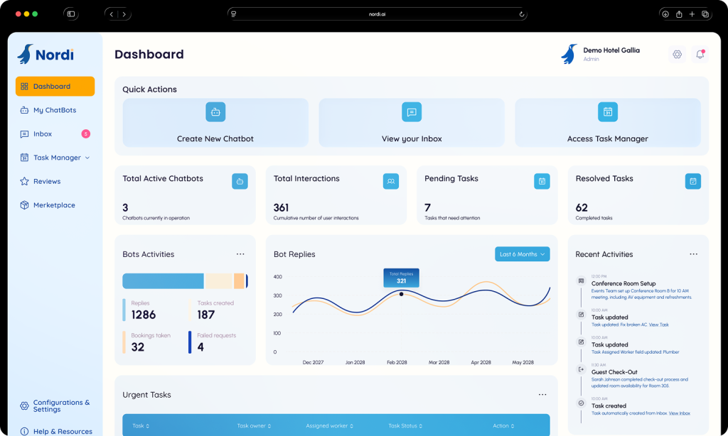 Nordi è un Concierge AI che automatizza le comunicazioni con gli ospiti, i task operativi e le attività di upselling. Funziona 24/7 in più lingue, gestisce segnalazioni automaticamente creando task per il tuo team e ti permette di vendere servizi ed esperienze tramite un marketplace digitale.