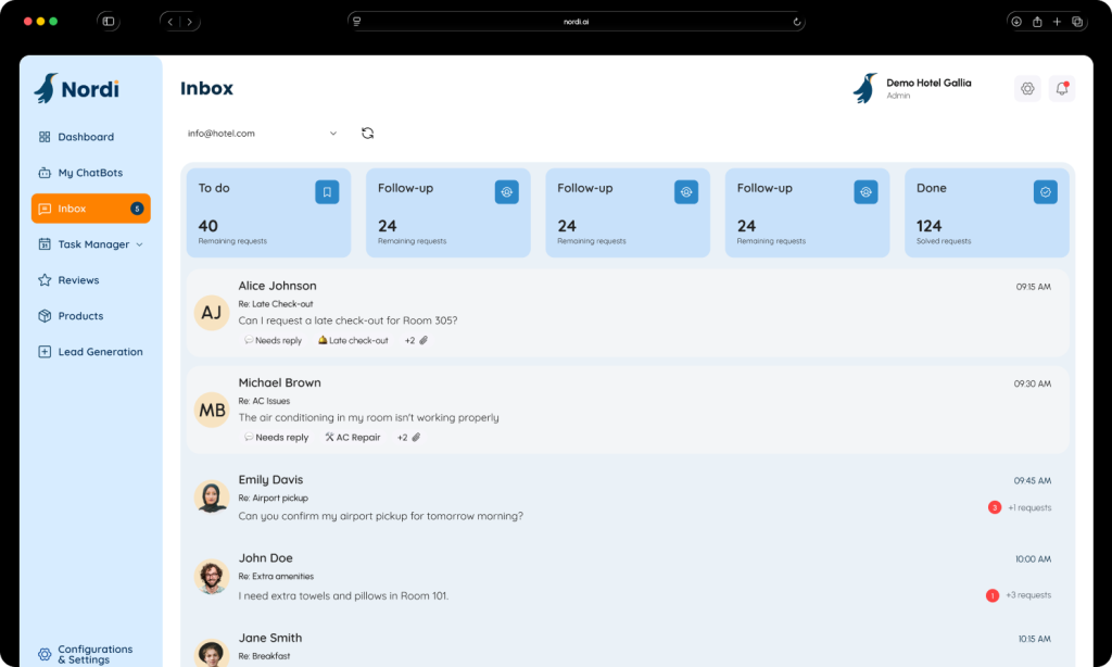 Centralizza le comunicazioni provenienti da Booking, Airbnb, WhatsApp, email e sito web. Gestisci tutto da un’unica interfaccia e lascia che Nordi ti aiuti con risposte rapide e contestuali grazie al supporto generativo.