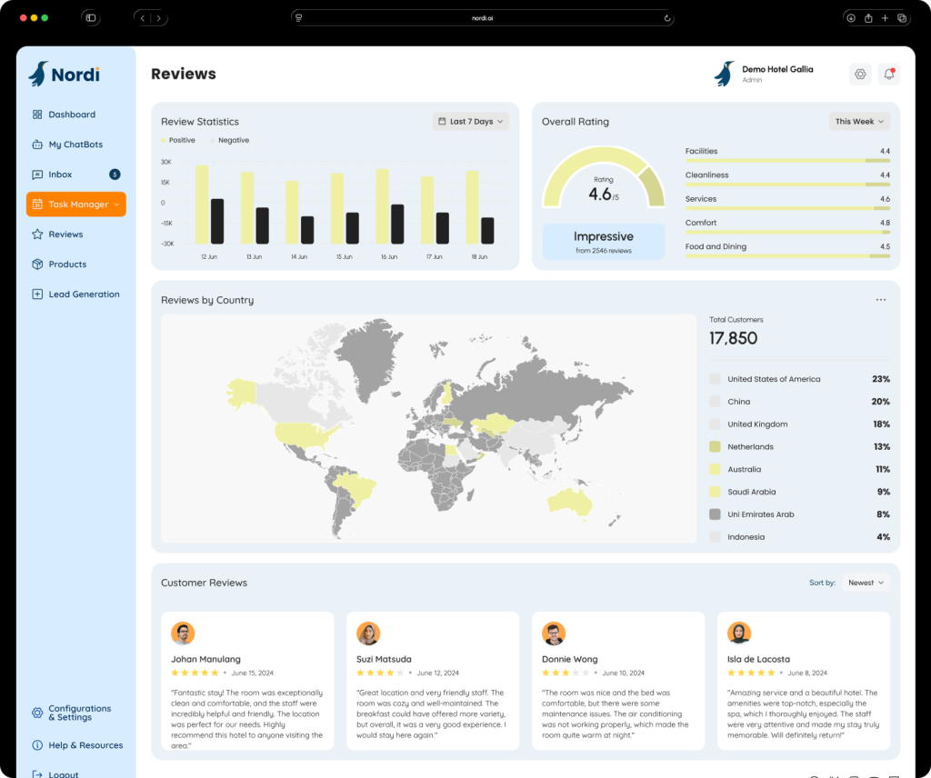 Nordi raccoglie e interpreta tutte le recensioni dai vari canali OTA, offrendoti analisi dettagliate e consigli pratici per aumentare la reputazione e la soddisfazione dei tuoi ospiti.