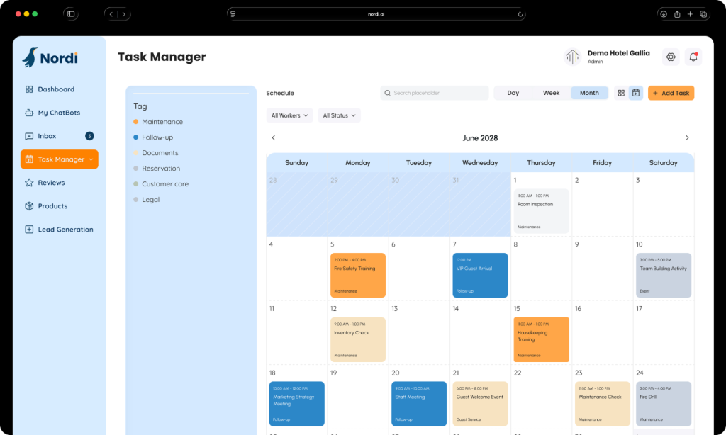 Coordina le attività del tuo team — dalle pulizie alla manutenzione — con task intelligenti, priorità automatiche e notifiche in tempo reale. Meno confusione, più efficienza.